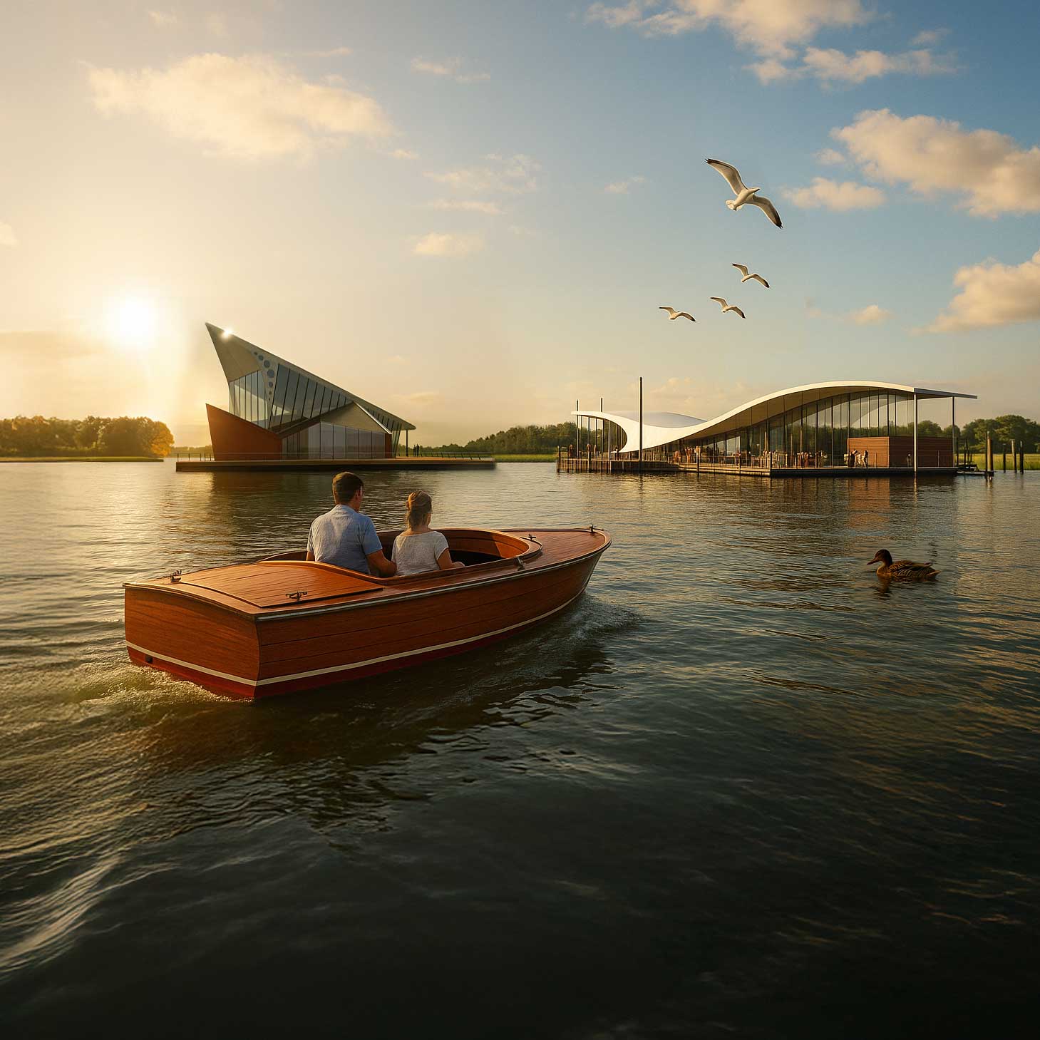 Wij ontwierpen twee drijvende paviljoens. Beide paviljoens hebben we een eigen naam en uitstraling gegeven. Juveniel dient als expositieruimte voor jonge ontwerpen, Adult meer voor oudheidkundige zaken. Beide paviljoens bevatten hetzelfde programma en ook hetzelfde aantal vierkante meters. Het programma omvat multifunctionele ruimtes die te gebruiken zijn als filmzaal, expositieruimte, of feestzaal. Daarnaast bevat het een winkel, een balie en een bergruimte.