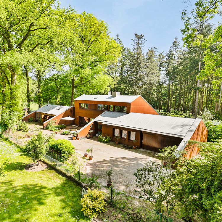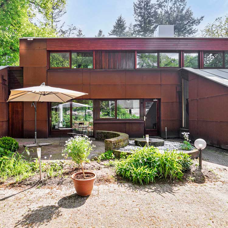 Het geheel vormt een krachtig contrast: warm cortenstaal tegenover koel grijs zink, grote vlakken tegenover subtiele lijnen, een sculpturaal object dat zich moeiteloos voegt in de bosrijke omgeving. Een woning die door haar eenvoud, materiaal en verhouding een vanzelfsprekende plek inneemt tussen de dennen — en tegelijkertijd onmiskenbaar opvalt.